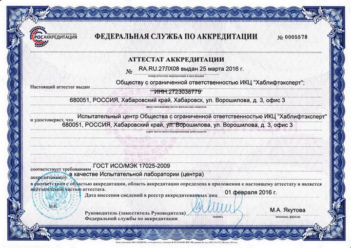 (Аттестат аккредитации RA.RU.27ЛХ08, выдан Федеральной службой по аккредитации, срок действия аттестата аккредитации с 01 февраля 2016 г. - бессрочный. (Приказ об аккредитации № А-431 от 20 марта 2013 г.))
